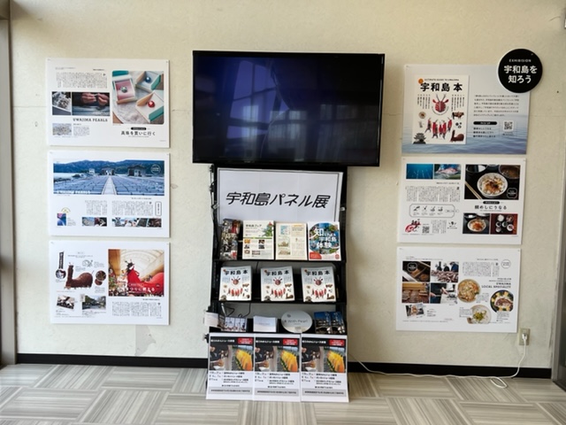 入口付近のパネル展。「ふるさとパンフレット大賞」で見事大賞を受賞した観光パンフレット「宇和島本」が展示されています
