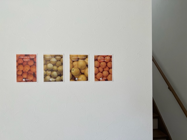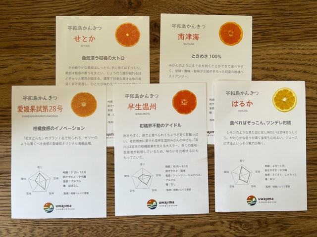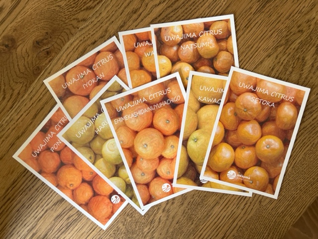 さきほどチラッと見せたみかんの品種を説明したカード。ポストカードサイズで、テイクフリーで会場に置いてあるんですが、宇和島市の中村さん曰く「これだけ壁に貼ってもオシャレになるように作ってあるんです」とのこと。カードの表はこちら。