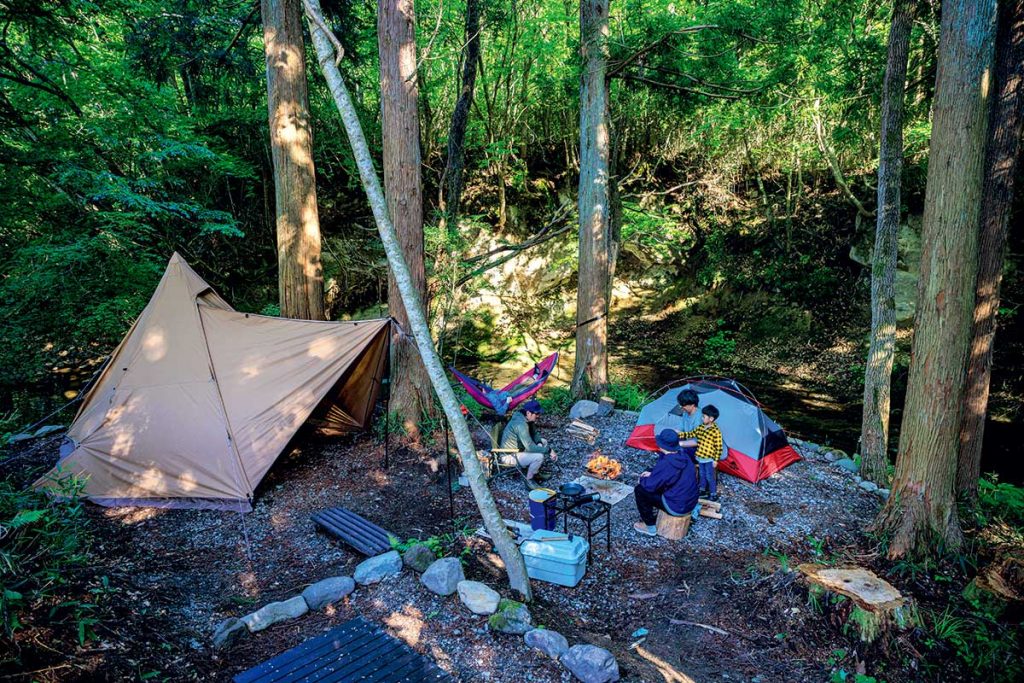 流れが穏やかな渓流と木々に囲まれたサイトは野営感抜群。夏場は涼しく、陽も遮るのでタープいらず