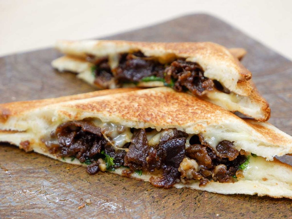 すき焼き煮とチーズ、サニーレタスをパンに挟んで、ホットサンドメーカーでぎゅぎゅっと焼き上げたホットサンドは、とろけるチーズと甘辛いすき焼き煮、こんがり焼けたパンがえも言われぬ相性。