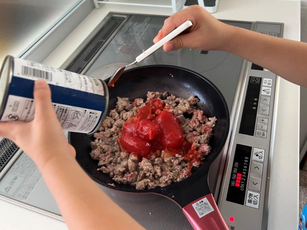 トマト缶を加えて、水気がなくなるまでさらに炒めます。yamanの山下さん曰く、トマト缶はイタリア産の細長いトマトがおすすめだそう!