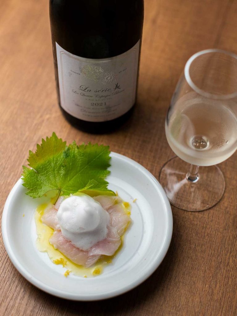 「白身魚のカルパッチョ 南仏オリーブオイルがけ」は、淡白なタチウオに松本シェフこだわりの塩とオリーブオイルというシンプルな味付け。さっぱりとした『了美ヴィンヤード&ワイナリー』の「ラセリー美 レカトル セパージュ ブラン2021」と組み合わせると、より旨みを感じます。