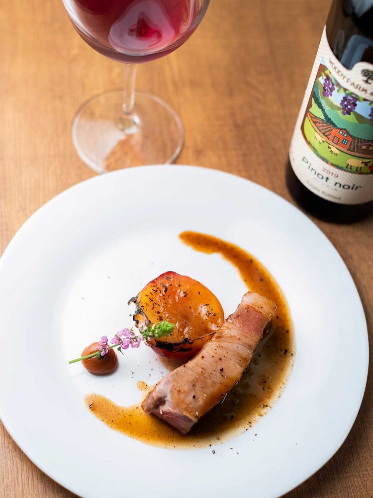「骨付KAZUHARA豚ロースト 西村山すもものキャラメリゼ」はワインを含め、すべての食材が山形県産。繊細で、味わい深い骨付き肉を使用し、キャラメリゼしたすももや、梅干しのピューレで好みの味に調整できます。のど越しのいい『ウッディファーム&ワイナリー』の「ピノノワール2019」とナイスマッチ!
