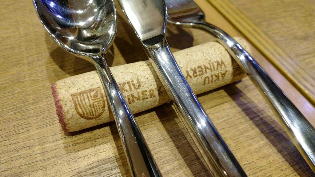 『秋保ワイナリー』で実際に使われたコルクをつなぎ合わせた、手作りのカトラリー置き