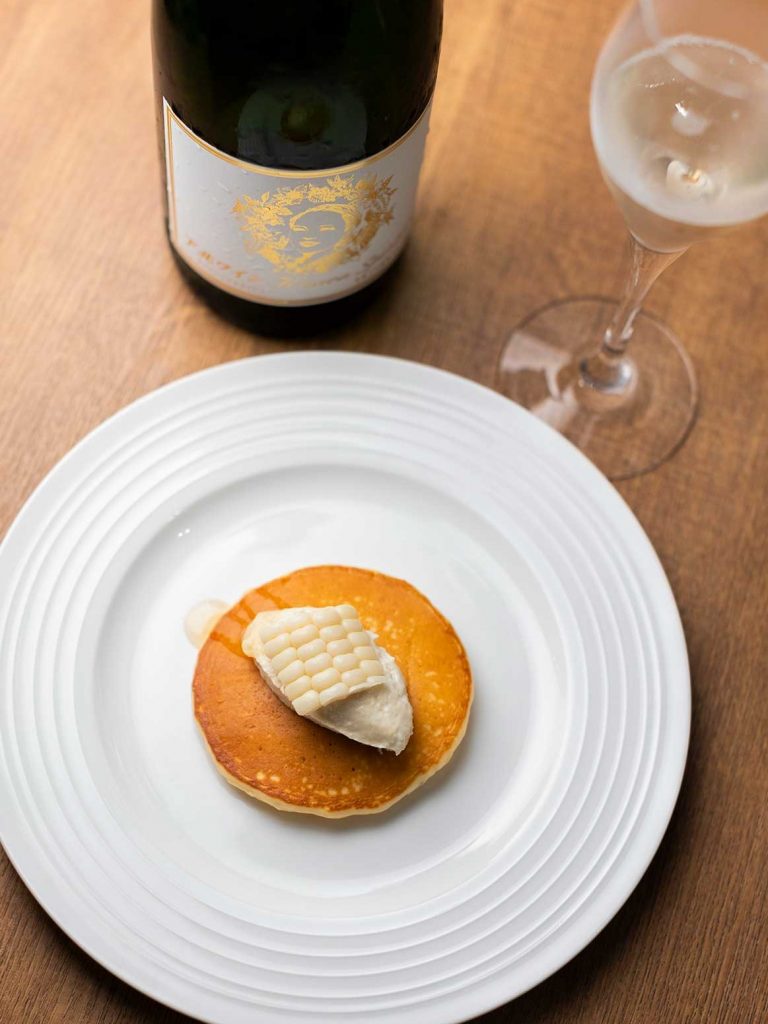「とうもろこしペーストを乗せたパンケーキ蜂蜜がけ」のパンケーキにはホエーを使い、鉄板で焼き上げます。トッピングは白いトウモロコシ“ピュアホワイト”と少し塩みのあるトウモロコシバター。シャンパーニュ地方と同じ製法で作られた『サンマモルワイナリー』の「カノン スパークリング2020」としっかりと調和します。