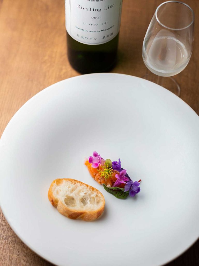 「みやぎサーモンタルタル ディル風味」のサーモンは、脂の乗った腹身を使用し、少しこってりと。それがディル、隠し味のショウガの爽やかさとマッチします。料理にはシャルドネの若実も入り、『高橋葡萄園』の「リースリングリオン2020」との相性がぐんと上がります。