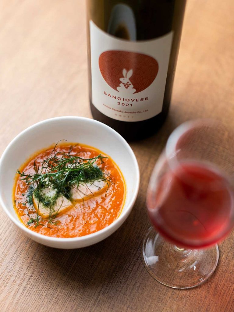 絶妙な加減で火入れしたメカジキは、驚くほどしっとり。フライにした香草が青みを醸し出し、『吾妻山麓醸造所』の「サンジョベーゼ2021」の個性とうまく調和しています。