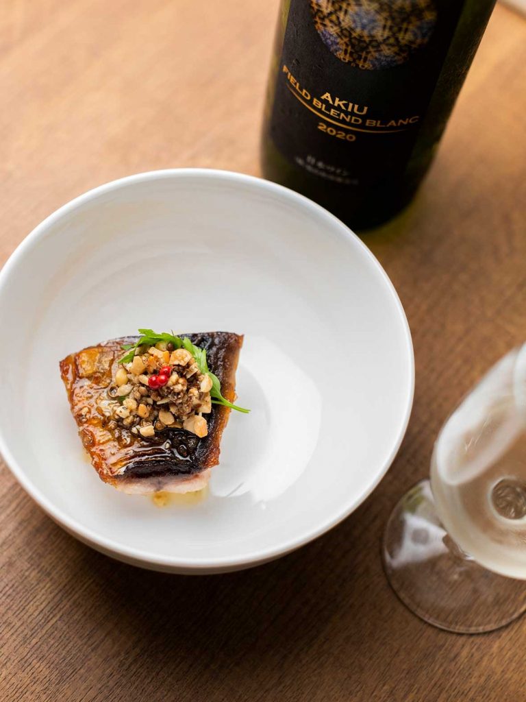 「金華鯖の燻製ソテー スパイスソース」は香りの強い金華鯖に、中東で使われるスパイスを組み合わせた一品。パリパリに焼かれた皮が強い主張をしつつも、数種類の白ワイン用品種をブレンドした『秋保ワイナリー』の力強い「フィールドブレンドブラン2020」と互いを引き立てあいます。