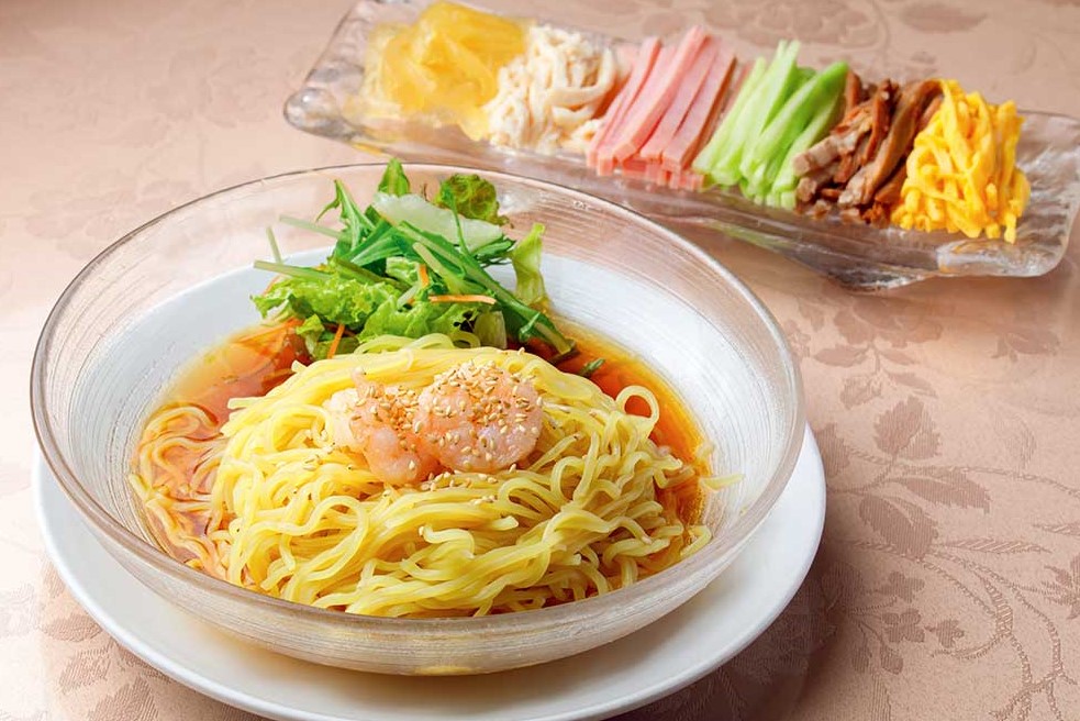 「冷やし中華の元祖店」として県内はもとより、全国的に知られる中国料理店。元々は点心がメインでしたが、夏の客足が落ちることに悩んだ初代が「暑くてもおいしく食べられるメニューを」と考案したのが始まりだそうです。その後評判を呼び、通年メニューへと定番化。90年代のグルメブームを経て、人気は全国区となりました。クラゲや蒸し鶏など6種の具材を別添えにした、見た目も華やかな冷やし中華が楽しめますよ。