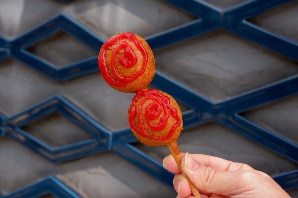衣のサクサク、かまぼこのふわふわとした食感も楽しい「ひょうたん揚げ」(250円)。ぐるぐるのケチャップもトレードマークです