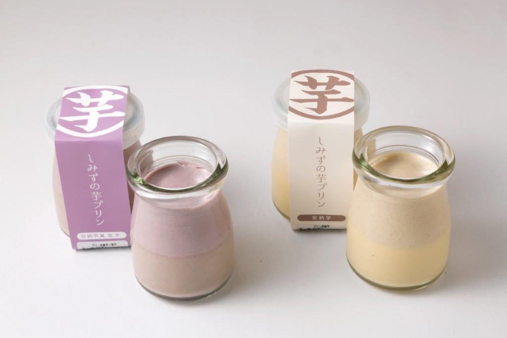 「安納芋」、「安納芋×紫芋」(各660円※テイクアウトは各540円)。濃厚でとろける食感のプリンはやみつき必至!