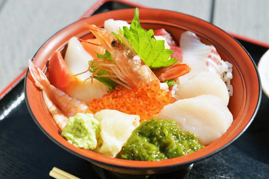 マグロやサーモン、貝類、イクラなどのネタがキラキラ輝く「女川丼」(1,500円)