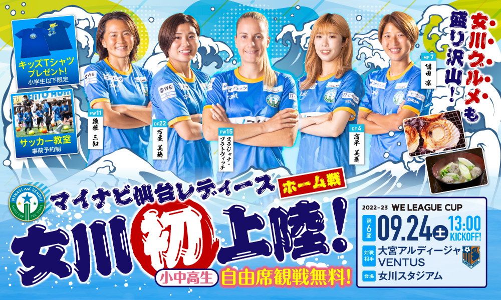 女子プロサッカーリーグ「WEリーグ」の2022-23WEリーグカップ「マイナビ仙台レディース」VS「大宮アルディージャVENTUS」戦が、2022年9月24日(土)に『女川スタジアム』にて開催。