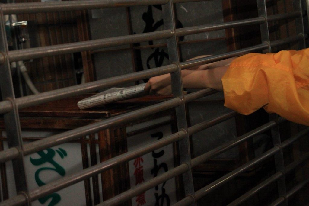 誌面に登場したのは投げVer.でしたが、落下Ver.もありました。階段下の店舗にむかってエイッ! 無事、下のマットに着地したのを確認した時、横たわる新聞から「届けてくれてありがとよ…」という声が聞こえたような気がしました。