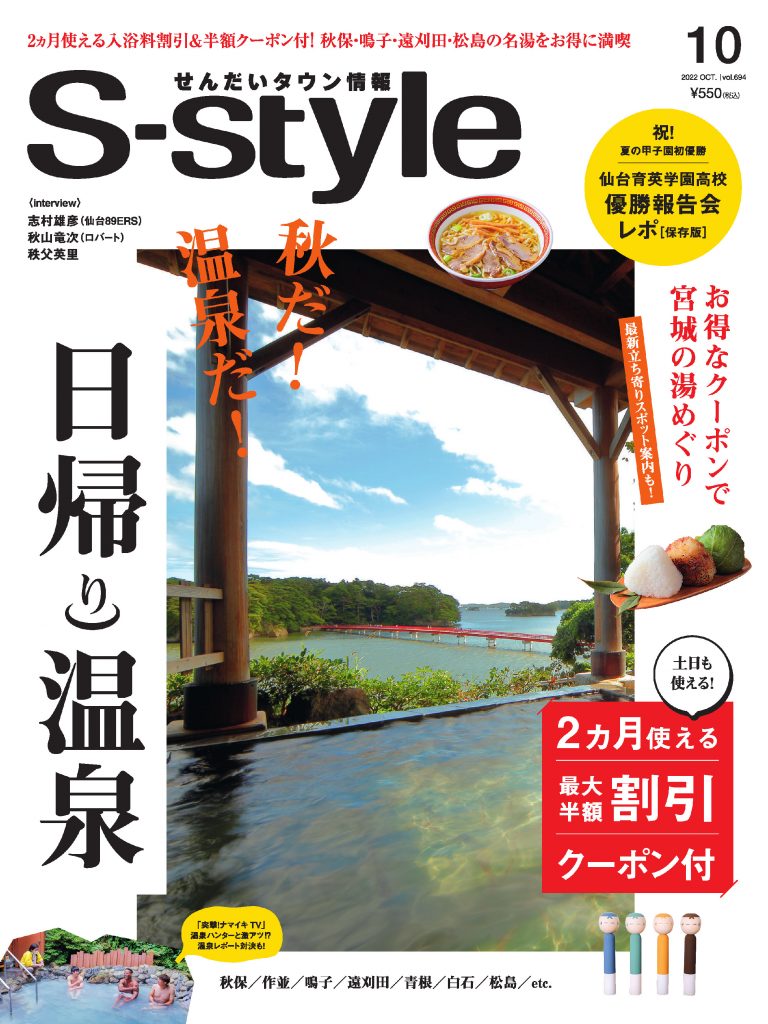日に日に寒くなり、温泉が恋しくなる季節がやってきました。今月号は3年ぶりに、秋の日帰り温泉を大特集。秋保、遠刈田、松島、鳴子など、県内有数の日帰り温泉はもちろん、温泉施設周辺の立ち寄りスポットも紹介しています。また、すでにO.A.は大反響(?)で終了しましたが、S-style編集部とkhb東日本放送の人気番組『突撃!ナマイキTV』がコラボしたスペシャルコーナーも必見です。