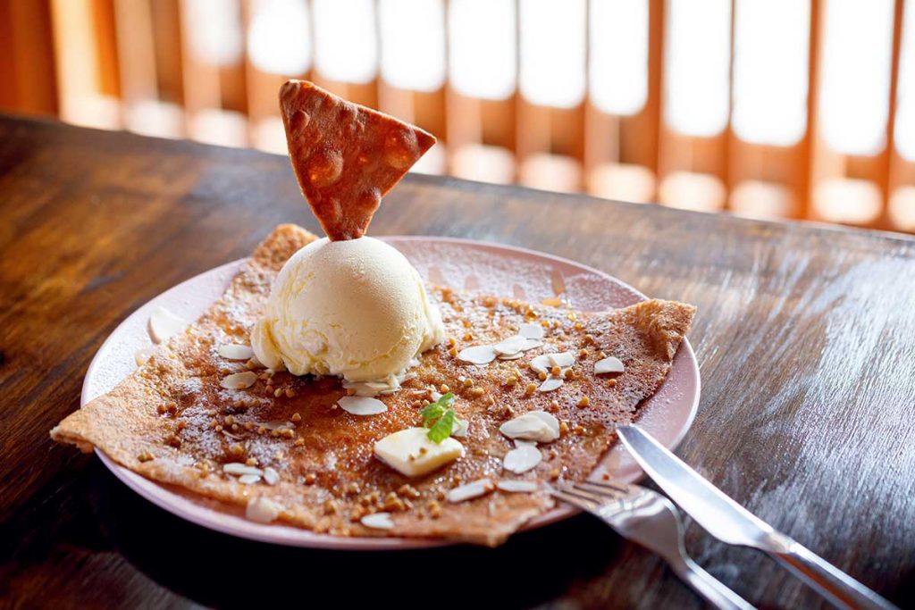 大きなバニラアイス、そばせんべい、そばの実をトッピングした「ハニーバターガレット」(1,000円)。そば粉、水、塩のみで作る生地がもちもち!