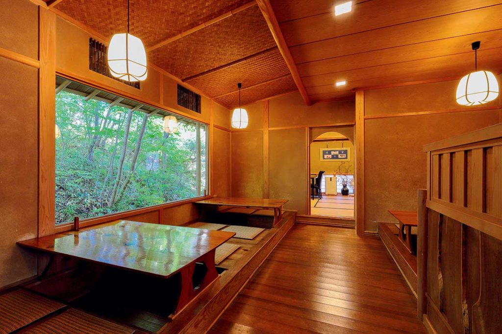 茶室をイメージし、店主自ら作り上げた静謐の空間。大きく切られた窓の外には、美しい四季の風景が広がっています