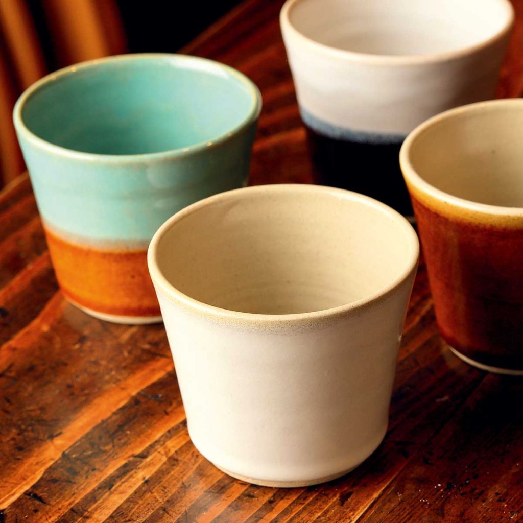色味も表情も一つひとつ異なる益子焼のそば猪口。軽くて手触りが良く、手にも食卓にもしっくりと馴染む店主のお気に入り