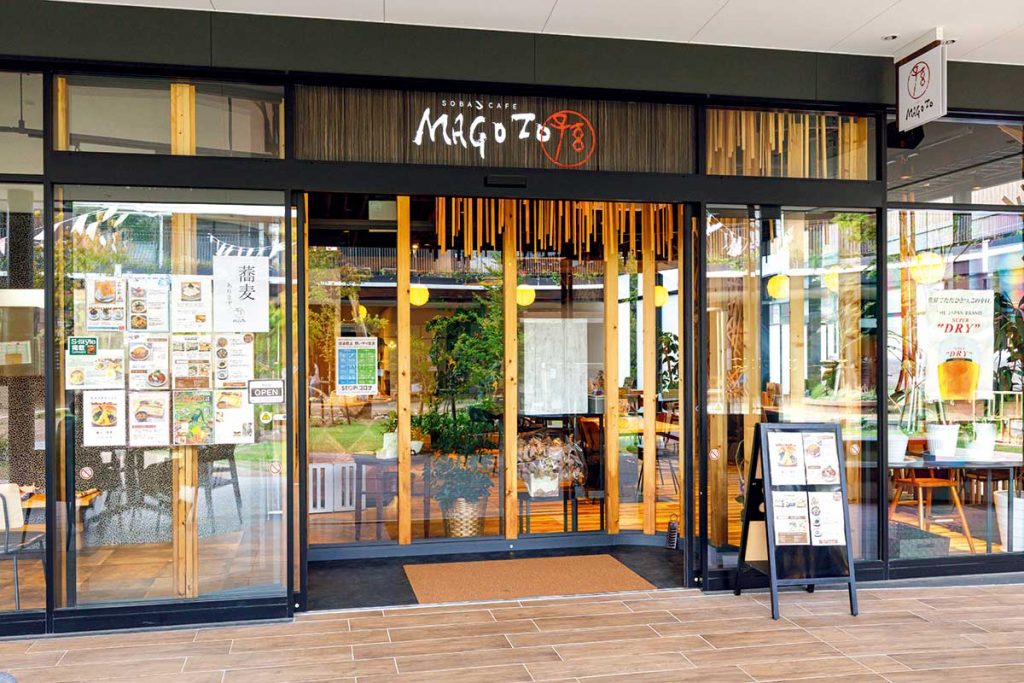 クリムゾンレッドの瓦屋根が印象的な外観。瓦の色に合わせたロゴマークは、ナイフとフォーク、そばの花がデザインされています