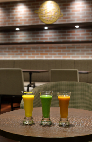 フルーツメインのオレンジと、野菜メインのグリーン、イエロー。素材の水分のみで抽出されたジュースは、美容や健康にうれしい一杯