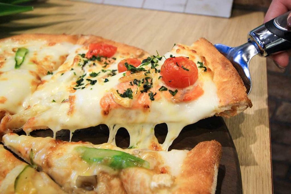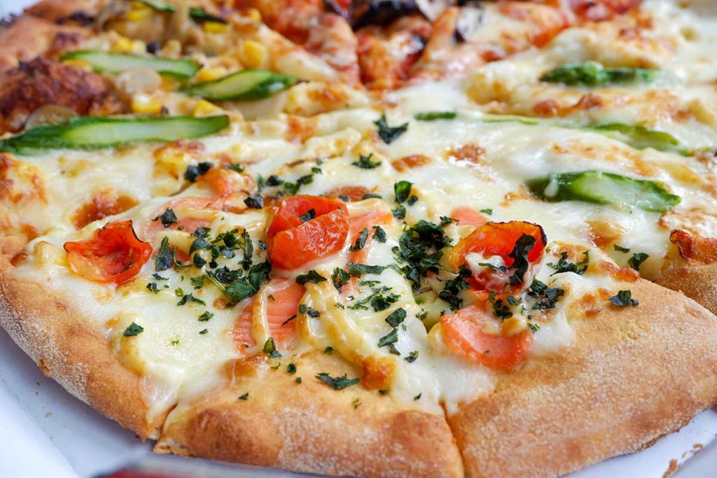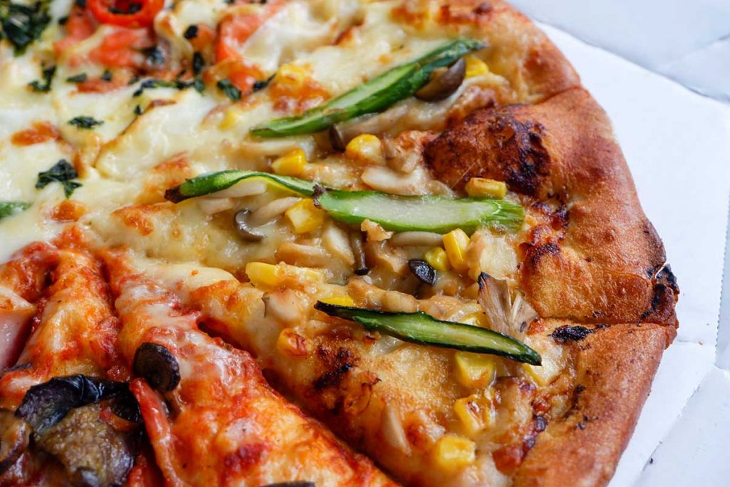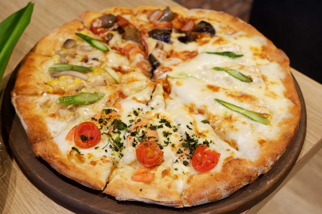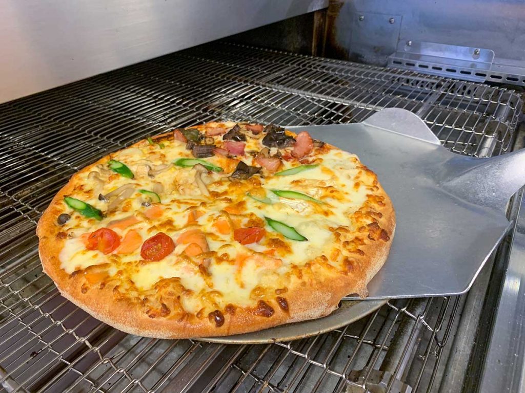 数分後、焼き上がりがこちら!ふっくら、こんがり焼きあがった生地にとろとろのチーズ、ふんだんに使用した各地の食材が食欲をそそる!