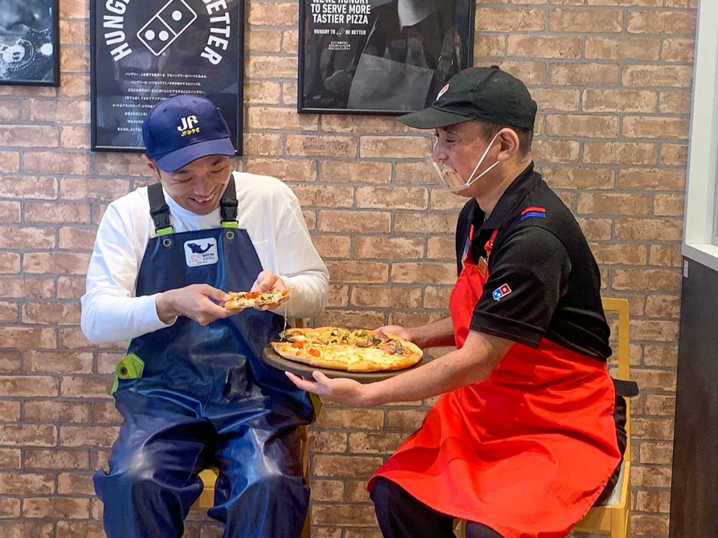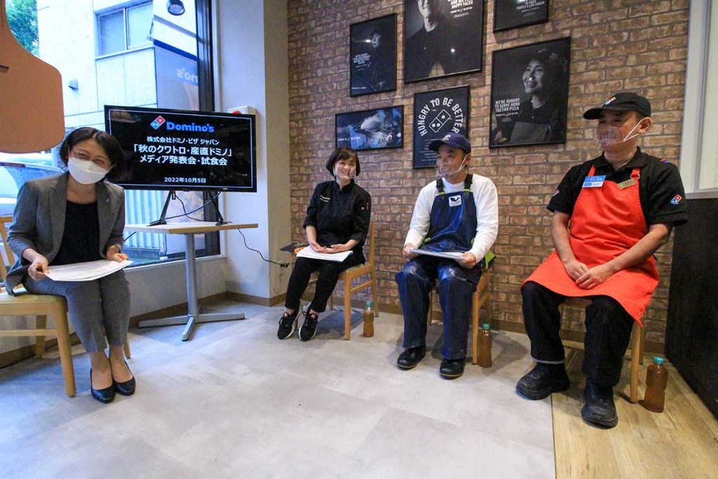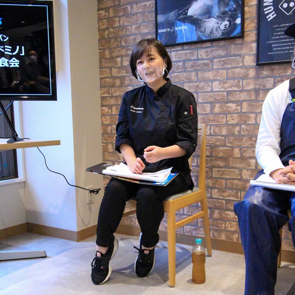 『ドミノ・ピザ』商品開発担当の大山幸恵(さちえ)さん、『ドミノ・ピザ』五橋店オーナーの渡邊雅人さんと共に、商品開発の秘話を披露しました。