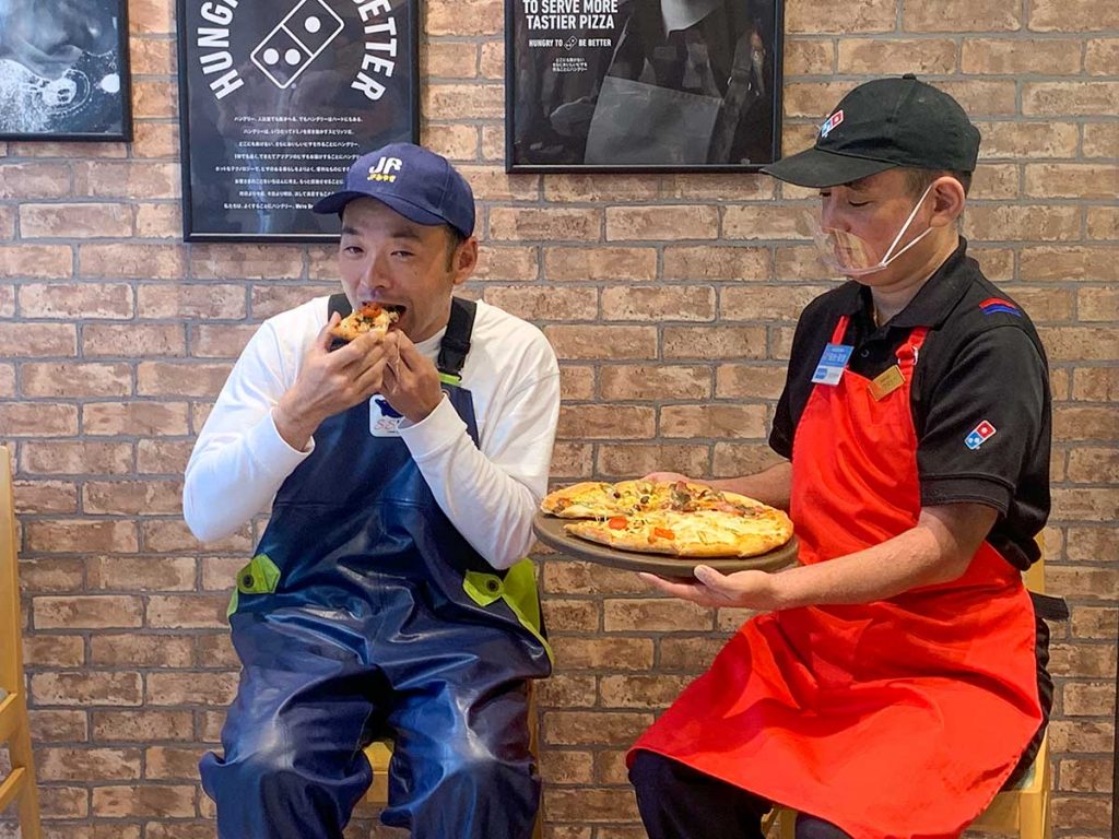 ピザを食べて笑顔で頷く鈴木さん。どうやら「合格」のよう!
