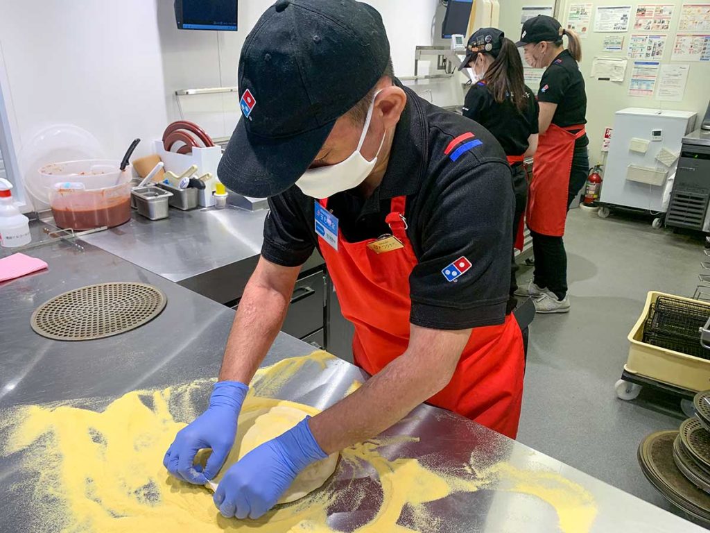 特別に厨房内の様子を見せてもらいました!店長の渡邊さんが生地を伸ばしている様子