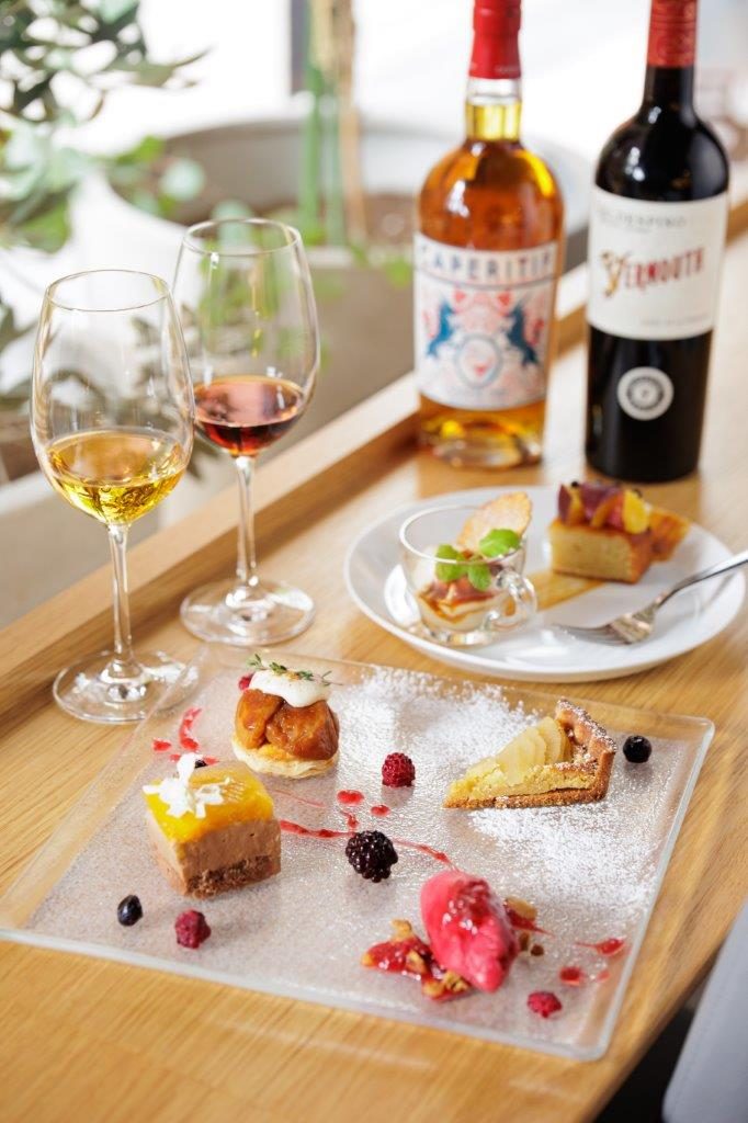 「デザートプレート」(1,500円)には、甘いデザートワイン「AAバーデンホースト/カペリティフNo.10」(左)や、「バルデスピノ/アペリティフヴェルモット」(右)を合わせるのがおすすめです