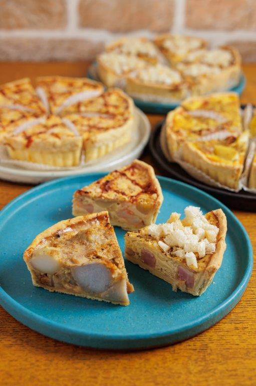 右から時計周りに「カルボナーラキッシュ」「ホタテと県内産里芋の和風キッシュ」(各580円)、「エビと泉区産仙台ダカラのトマトクリームキッシュ」(620円)