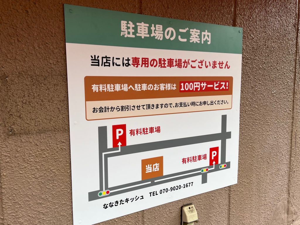 駐車は近隣のコインパーキングへ。パーキング利用の旨を伝えれば、会計から100円引きになりますよ!