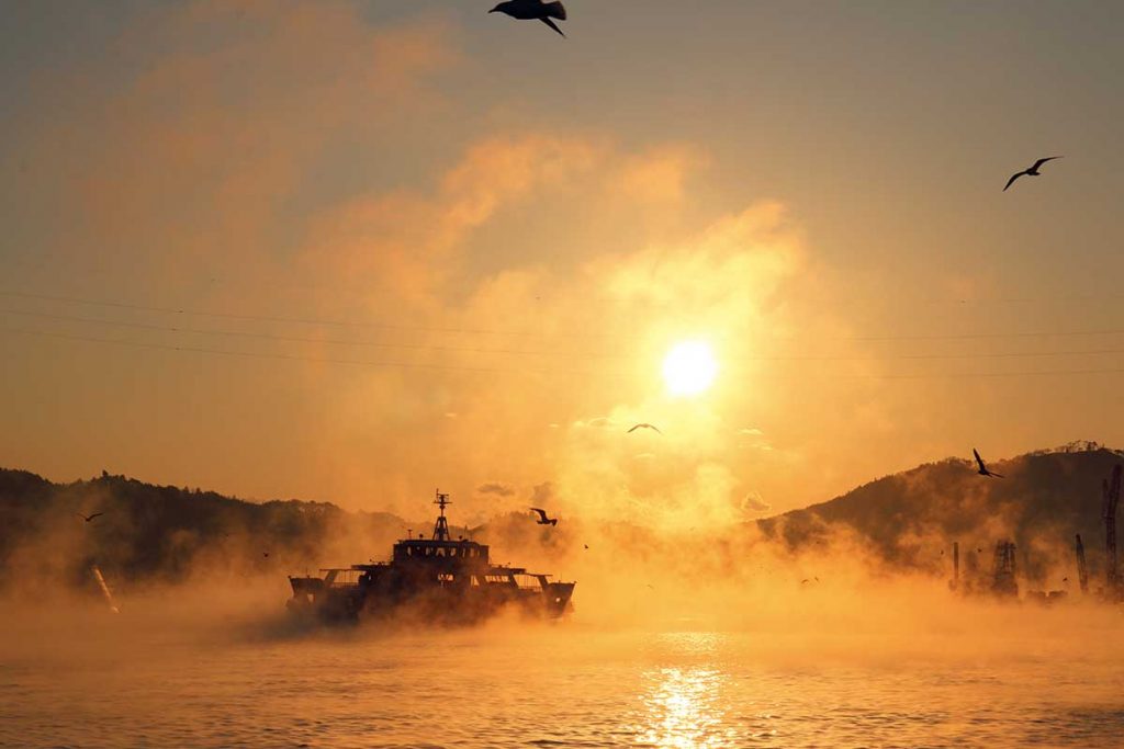 気仙沼の冬の風物詩。立ちこめるもやに朝陽が射す湾内は幻想的。12月末まで「気嵐&港町ミニツアー」を開催中です。