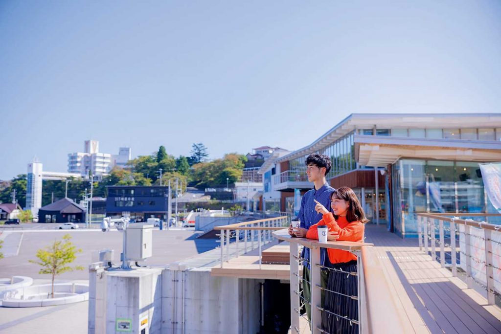 「迎(ムカエル)」など4つの施設が連なり、海を望むカフェやサメ革グッズを扱う土産ショップなどが揃う「ないわん」。係留された漁船が並ぶ岸壁など、写真映えスポットもいっぱい!