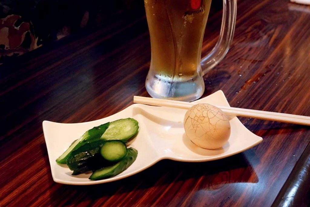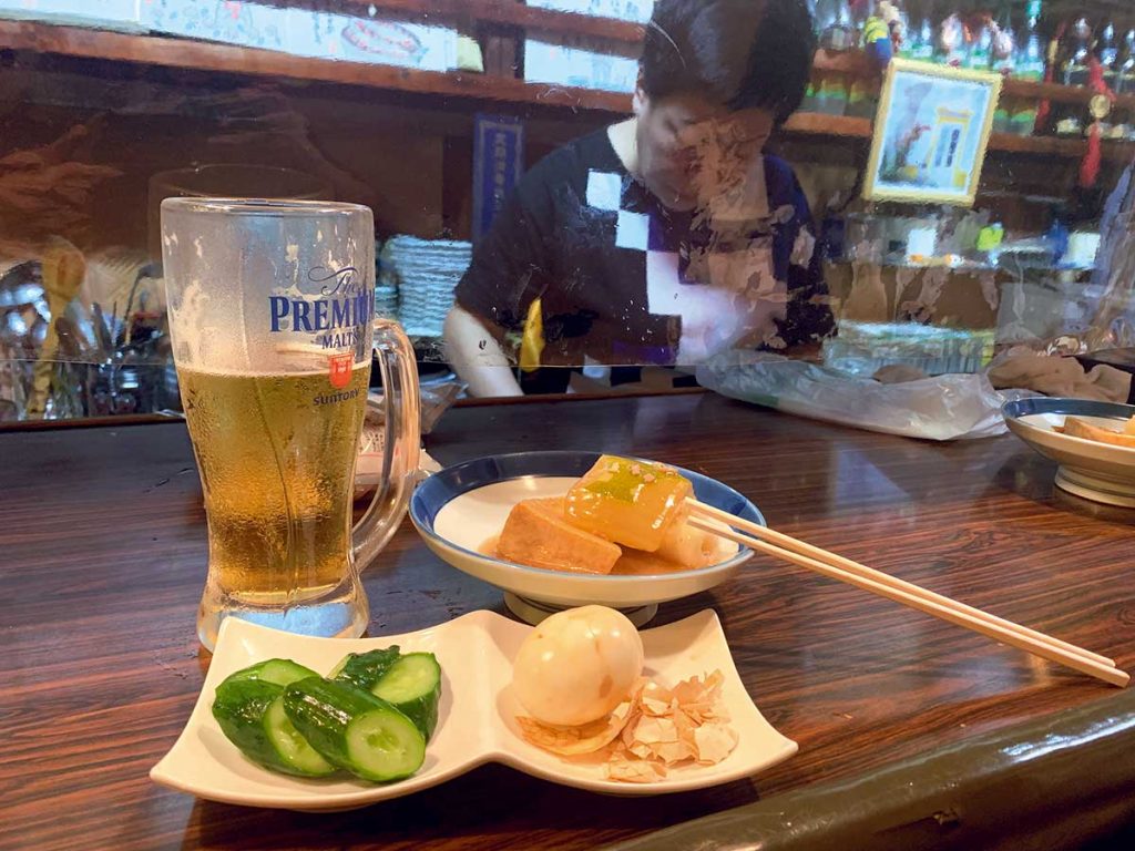 今日の横丁はしご酒はキュウリの漬物と煮タマゴからスタート!
