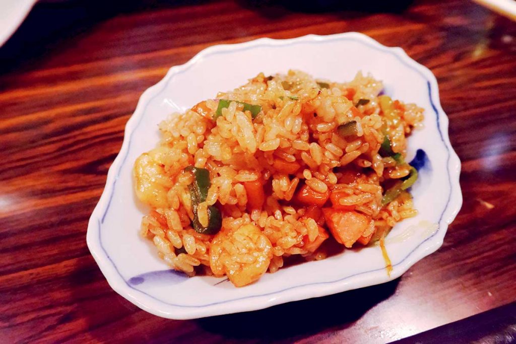 これがその黒醤油チャーハン。一粒ひと粒しっかり旨みをまとったお米に、エビ、ハム、野菜と具材も盛りだくさん