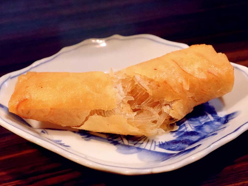続いて揚げたての春巻が登場。本場中国では、春雨だけが入ったこの春巻がスタンダードなんだとか!はじめて食べましたが、皮パリパリ、中つるつる・ホカホカでとってもおいしい