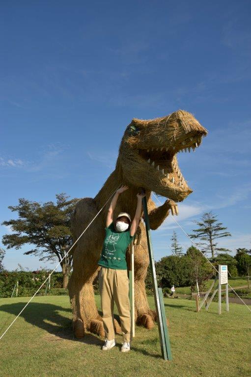 わらで作られた迫力満点の恐竜たちを見て触って、カメラで撮影して。