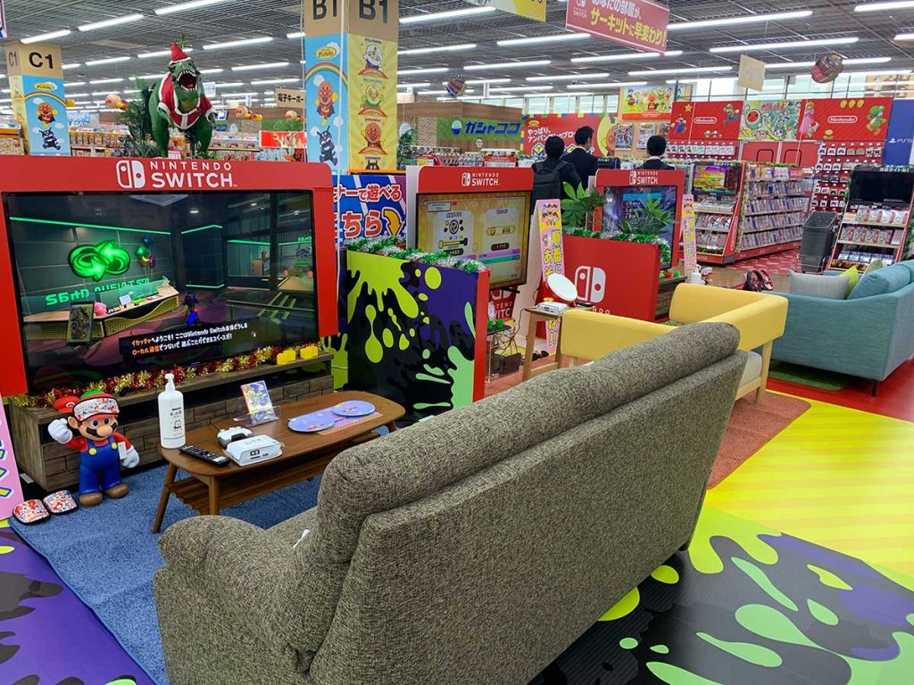 なんとゲーム機コーナーにはまるでお部屋なゲームコーナーが!この日は「マリオカート」「スプラトゥーン」「太鼓の達人」を試すことができました。ここは行列必至でしょう