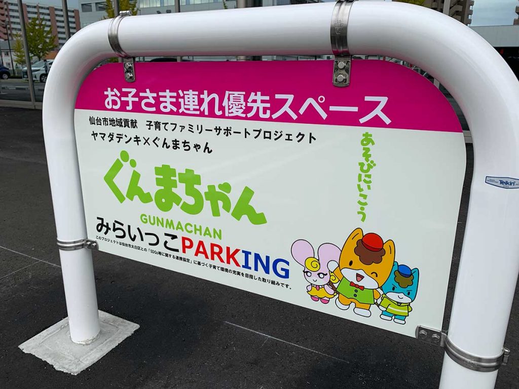 さらにこの『ヤマダデンキ Tecc LIFE SELECT 仙台あすと長町店』。太白区と連携協定を結び、子育てファミリープロジェクト「ぐんまちゃんみらいっこPARKING」と銘打ってお子様連れ優先駐車スペースを全国初設置。道路はす向かいの「あすと長町中央公園」利用者にも駐車場を貸し出すんだとか!