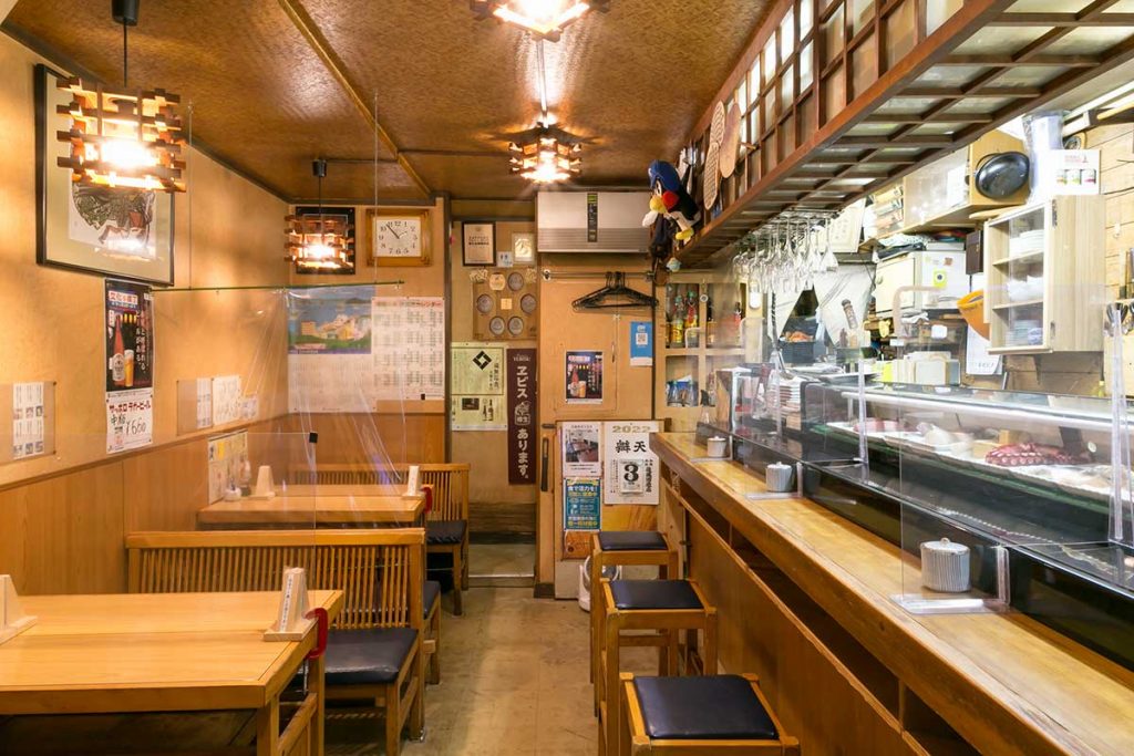 70年以上愛され続ける実直な江戸前寿司の店。1階にはカウンターが5席と、2人掛けテーブルが2卓。2階もあり16名まで利用できる