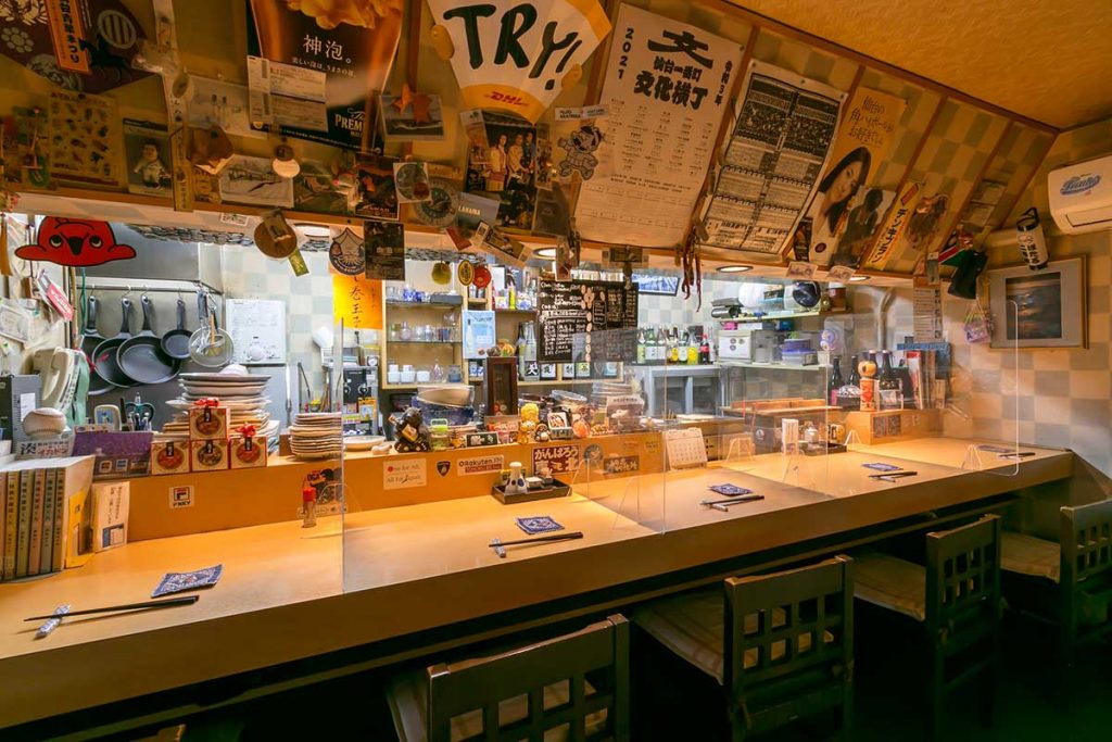 味が染みたおでんと日本酒が自慢の一軒。カウンターや壁を彩るお土産品は、店が多くの人に愛されている証。 初めての客も気軽に入れるウェルカムな雰囲気だ