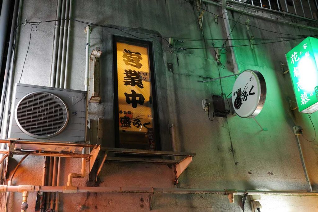 横丁の鉤手と直線がぶつかる角に建つ、牛たんと炭焼き海鮮、本場泡盛と沖縄家庭料理の店。白い暖簾と手書きのボードが目印