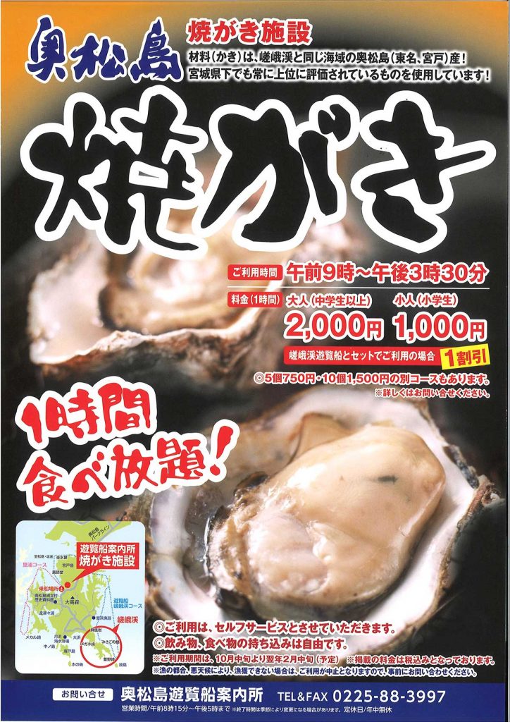 奥松島コースのスタート・フィニッシュ地点である『あおみな』内には、焼きがき施設があります。地元でとれた牡蠣の食べ放題を満喫しよう!