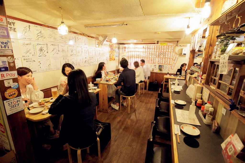 入口からは想像がつかないほど中は広々。壁はたくさんのメニュー表と著名人のサインで埋め尽くされています