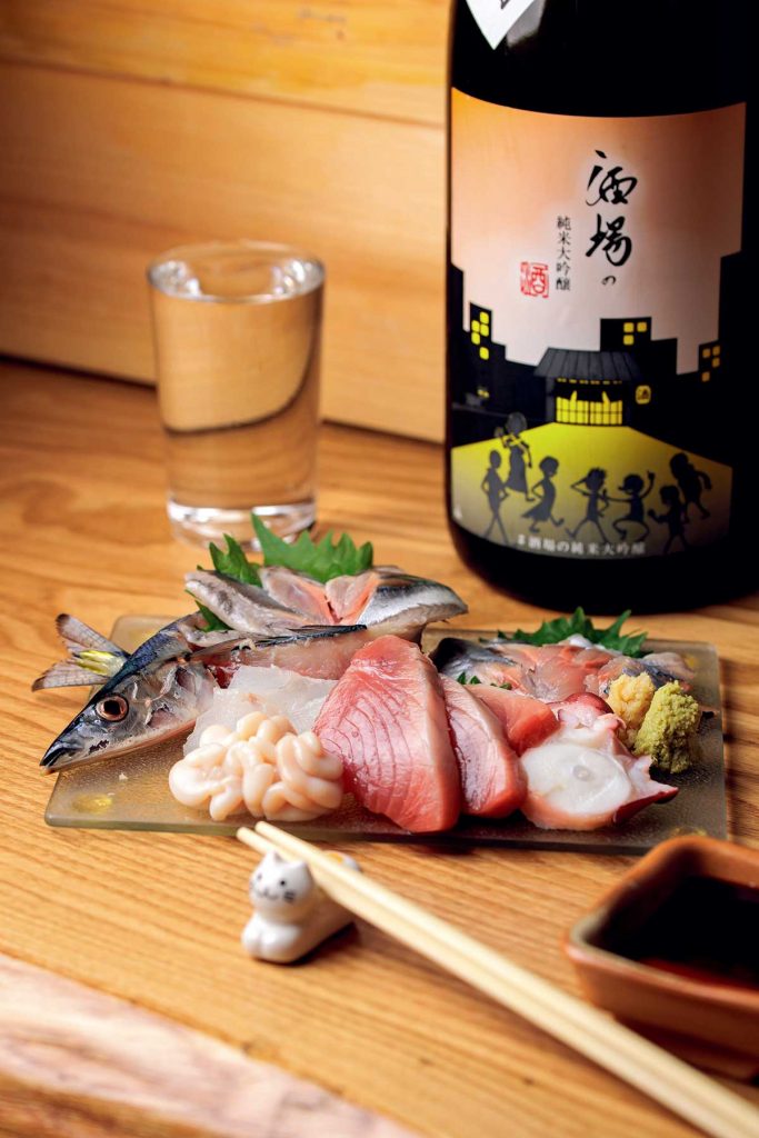 内容はおまかせの「刺身の盛り合わせ」(写真は3人前・2,000円)。新澤酒造店の飲食店限定品「酒場の純米大吟醸」(グラス・700円)