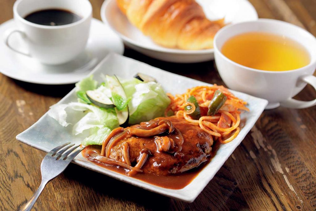 「ハンバーグ」(880円)や「ナポリタン」(780円)などのランチメニューには、お客さんと一緒に育てた無農薬野菜を使用しています