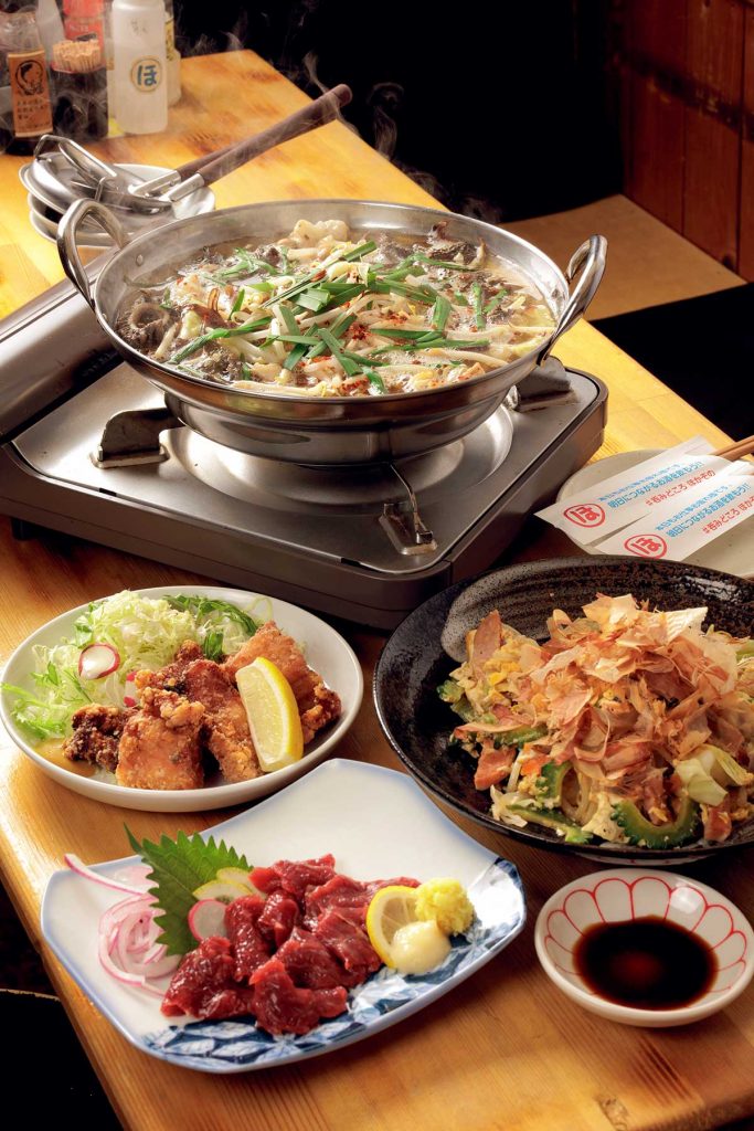 牛もつ鍋2人前、熊本直送馬刺し、ゴーヤーチャンプルーに、おすすめの一品が付く「九州定番セット」(5,500円)