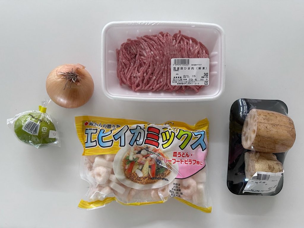 あちきのテーマは「アジアンテイスト」。ひき肉にレンコン、シーフードにタマネギ、アクセントにライムをチョイス