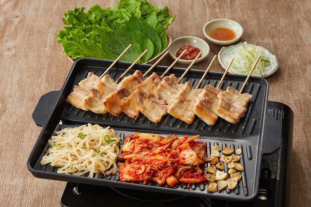 「サムギョプサル串」(1,980円)。取り分けやすい様に串で提供しています。家族や友人とシェアしながら、韓国の定番料理に舌鼓!