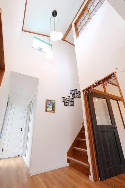 あかるく、あたたかな陽差しが降り注ぐ吹き抜けの玄関。元々の家が持つ良い部分を活かせるのも中古戸建てリノベーションの魅力!